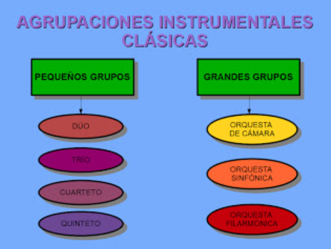 Tres tipos principales: 1.- Agrupaciones del mismo instrumento. 2.- Agrupaciones formadas por algunas familias de instrumentos, como la banda o la orquesta de cuerda. 3.- Agrupaciones formadas por instrumentos de todas las familias, como la orquesta sinfónica o banda sinfónica.